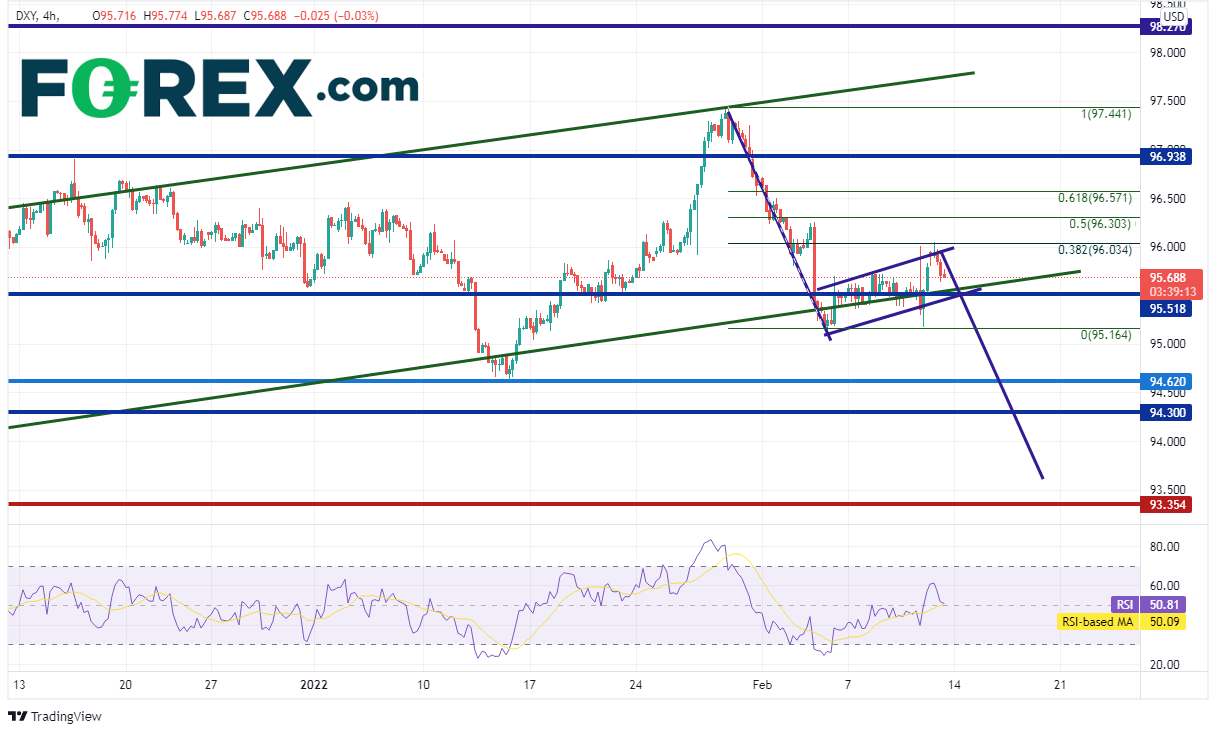美元指数2021年5月以来一直交投于一个上涨通道内。2021年11月价格一度向上突破通道,最高达到98.91,只是随后回落至通道内并在1月12日考验通道下轨所在的94.66附近。美元指数之后再度摸至2021年11月高点到1月12日低点95.54附近行情的127.2%扩展位,该位也是通道上轨趋势线所在。价格形成黄昏之星后回到通道的下轨趋势线,目前就落在该趋势线所在的95.50附近上方不远处。