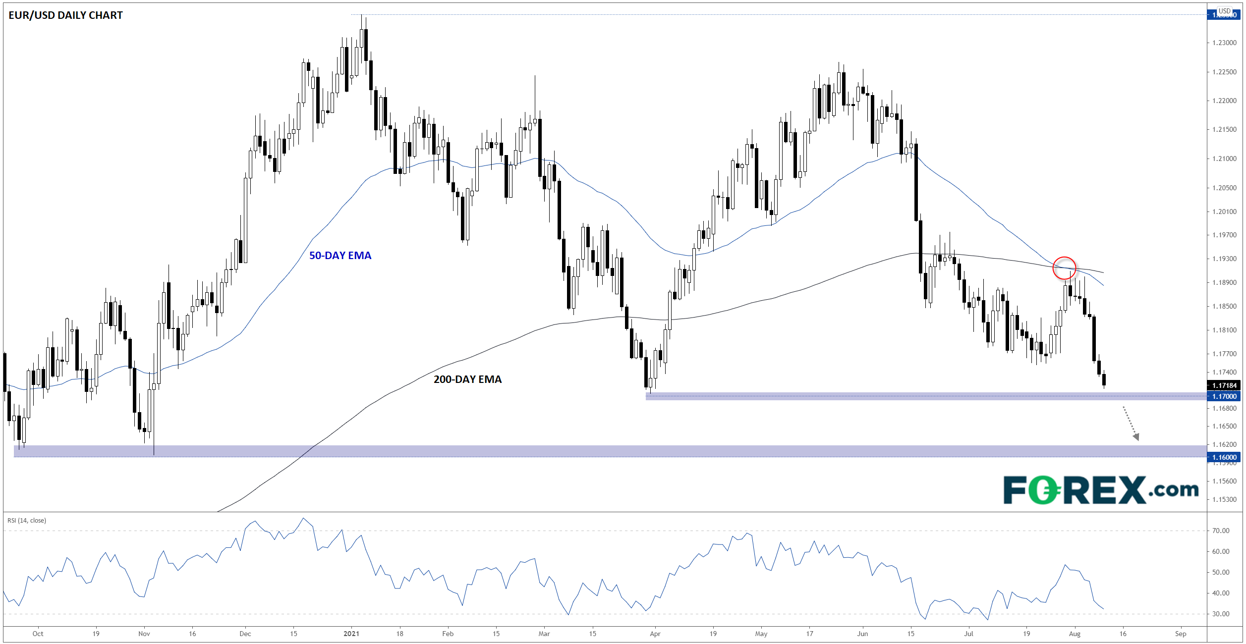 包括今天(未完成的)行情在内,欧元/美元正走在连续第八天下跌的途中,期间高低点之间的落差接近200点子。在这波暴跌行情之前欧元/美元形成了“死叉”,即50天指数移动均线下穿200天指数移动均线。这个听起来不吉利的名称预示后市看跌,对于欧元/美元来说意味着空头自2020年6月以来首次掌握较长期趋势。