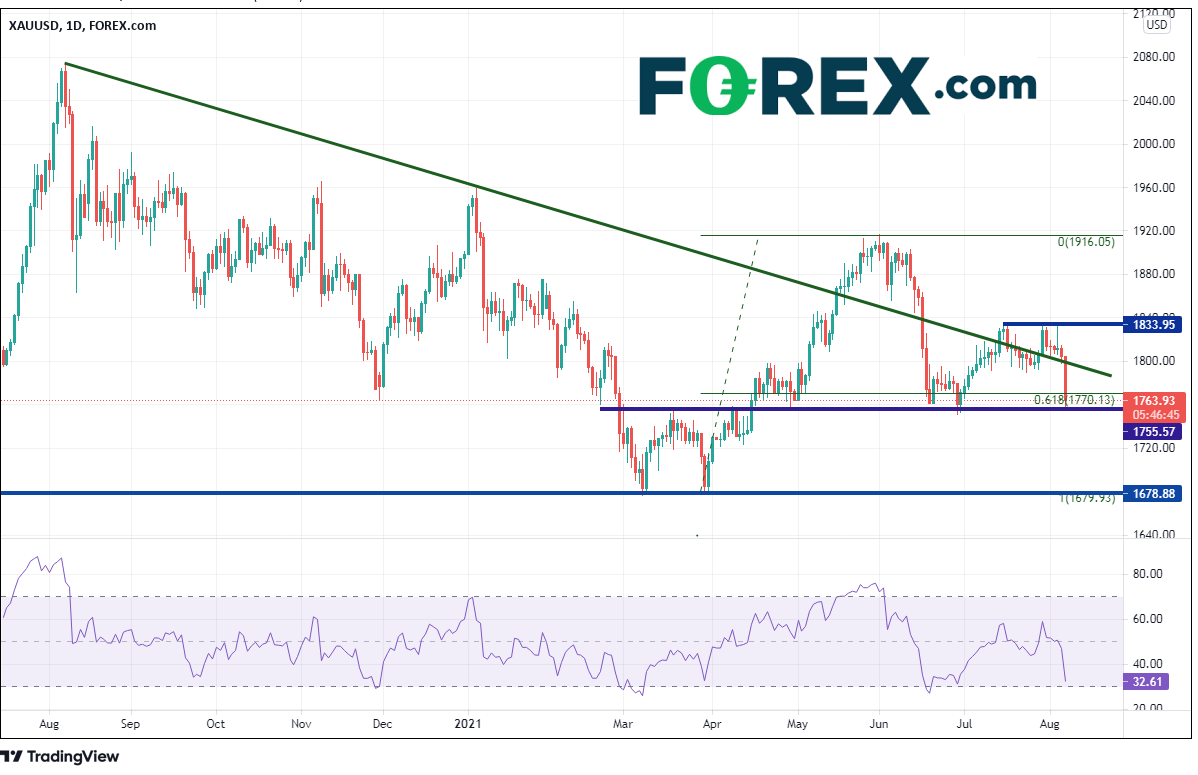 随着美元走高,现货黄金(XAU/USD)也开始受到冲击。黄金已跌破2020年8月高位1795附近下行趋势线,并正测试1756/1770附近水平支撑和3月29日低点至6月1日高点上行之61.8%斐波那契回档。若失守,价格可能探向3月29日低点1679。阻力位落在今日高点1804.5,然后是1834附近近期高点一线水平阻力位。