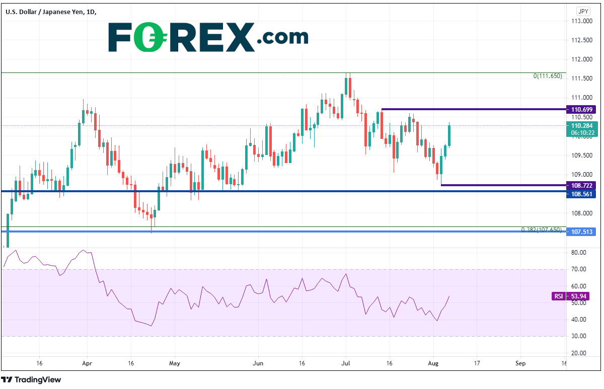 今天的强劲非农数据揭晓后,美元和美债收益率开始大幅飙高。对美债收益率尤为敏感的美元/日元迎来旺盛买需。在过去的3天里,货币对自108.72攻入今天(迄今)高点110.35。仅今天一天,美元/日元就上涨了54点子(0.50%)。上方水平阻力位在110.70,然后是7月2日高点111.51。支撑位落在今日低点109.70,然后是本周低点108.72。