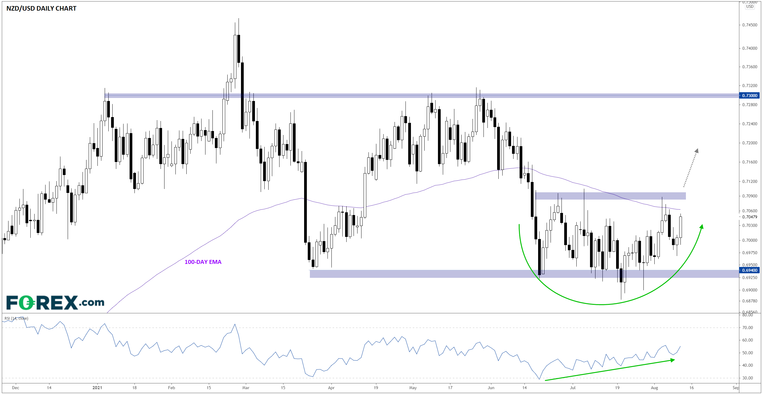 具体来看,周三的上述走势中波动最大的是纽元/美元。过去两个月里,该货币对似乎在0.6900一线下轨的支撑位附近构筑潜在“圆底”形态。交易者现在期待站上100天指数移动均线与前阻力位0.7100附近,确认前述形态的同时打开延续上涨的空间,目标0.7300附近阻力区域。