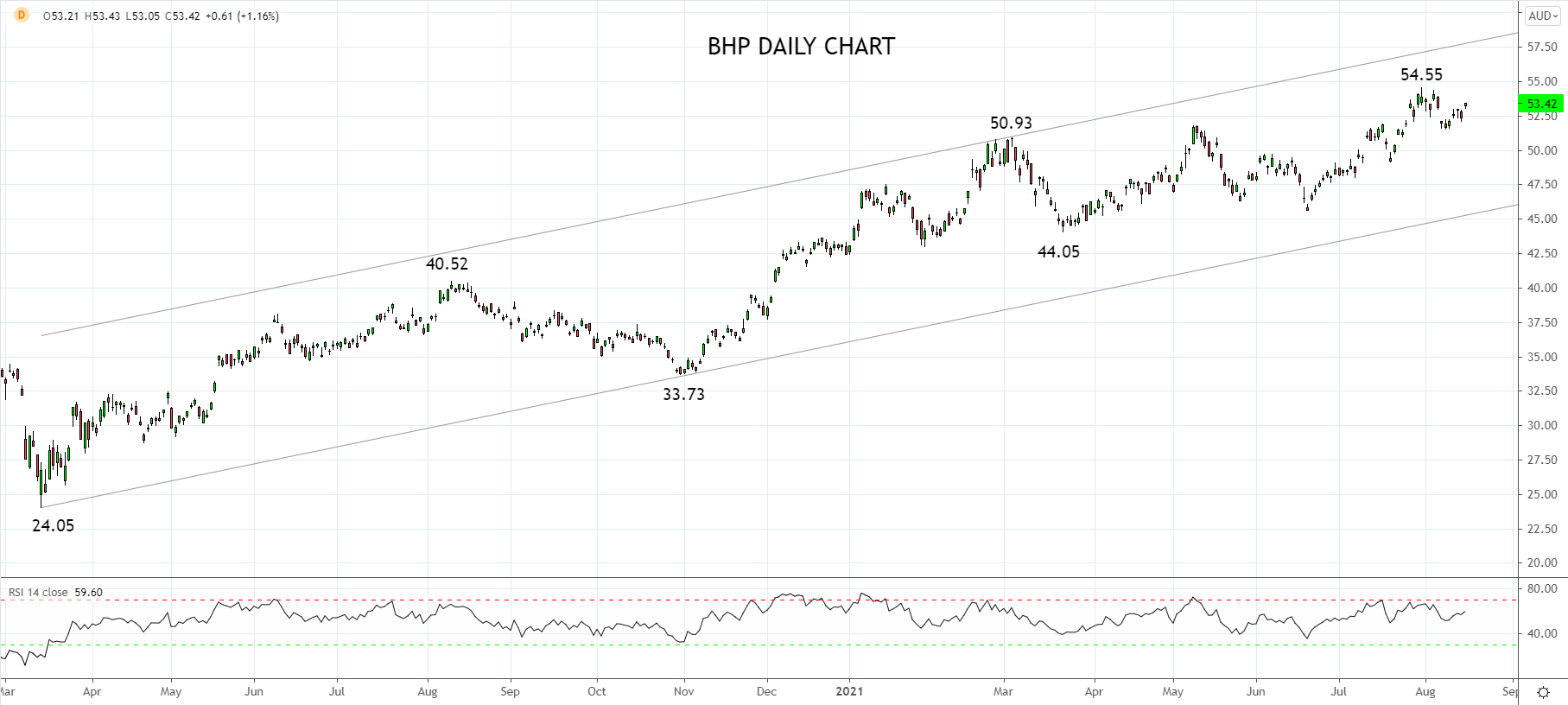 技术面看,必和必拓股价正处于2020年3月低点24.05以来的上涨趋势中。阻力位在7月底高点54.55,然后是趋势通道阻力57.50。下档第一支撑位在50.00,然后是趋势通道支撑45.50。