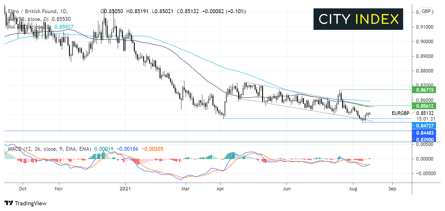 货币对自上周触及的18个月新低1.8450反弹,目前已收复0.85。MACD指标看涨交叉支撑进一步上行。