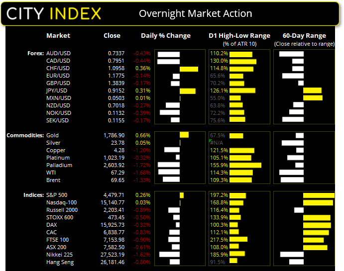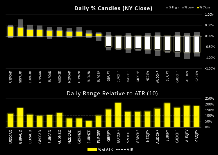 在经典的避险交易环境中,日元和瑞郎最强,得到避险资金流的支持;商品货币(加元、澳元和纽元)最弱。瑞郎和日元货币对间也出现了震荡。