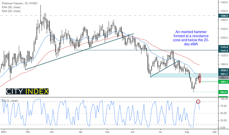 铂金似乎正尝试构筑波段高点。日图表明其仍处于原有下跌趋势内,且其修正行情在20天指数移动均线处遇阻。RSI (2)到达超买区域后回落并下破90,伴随着昨天的倒锤子形态。如果下破1000,可能确认倒锤子形态,并且价格后市可能同样下破周图中枢点位和月图第一中枢支撑位。