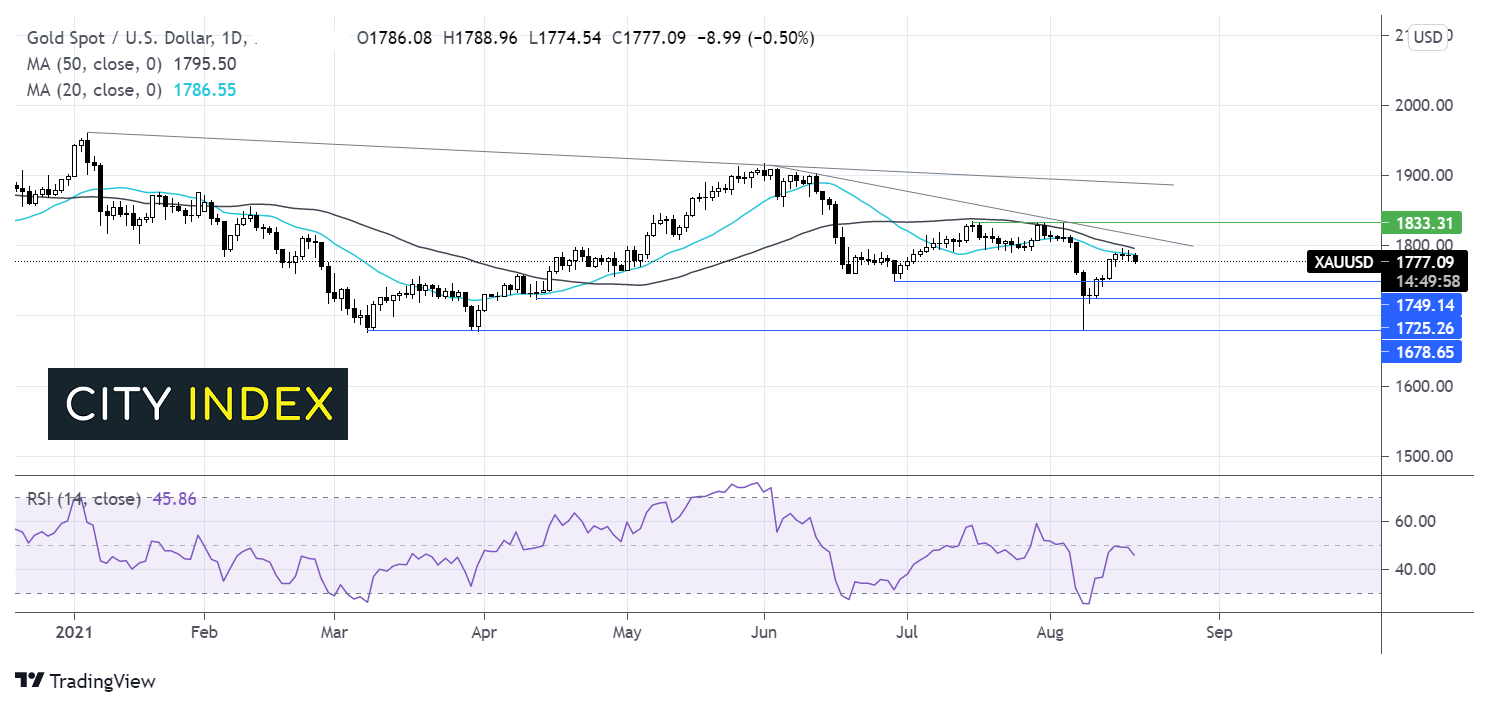 支撑见于6月低点1750点,然后是4月低点1730点,接着空头可能会等待金价再度测试8月低点1679。