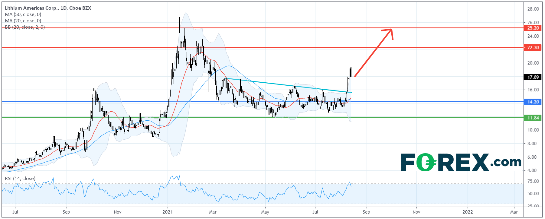 从技术角度看,如日线所示,Lithium Americas股价走势出现向上突破,升破了3月以来的盘整区,并远离20日及50日移动均线。