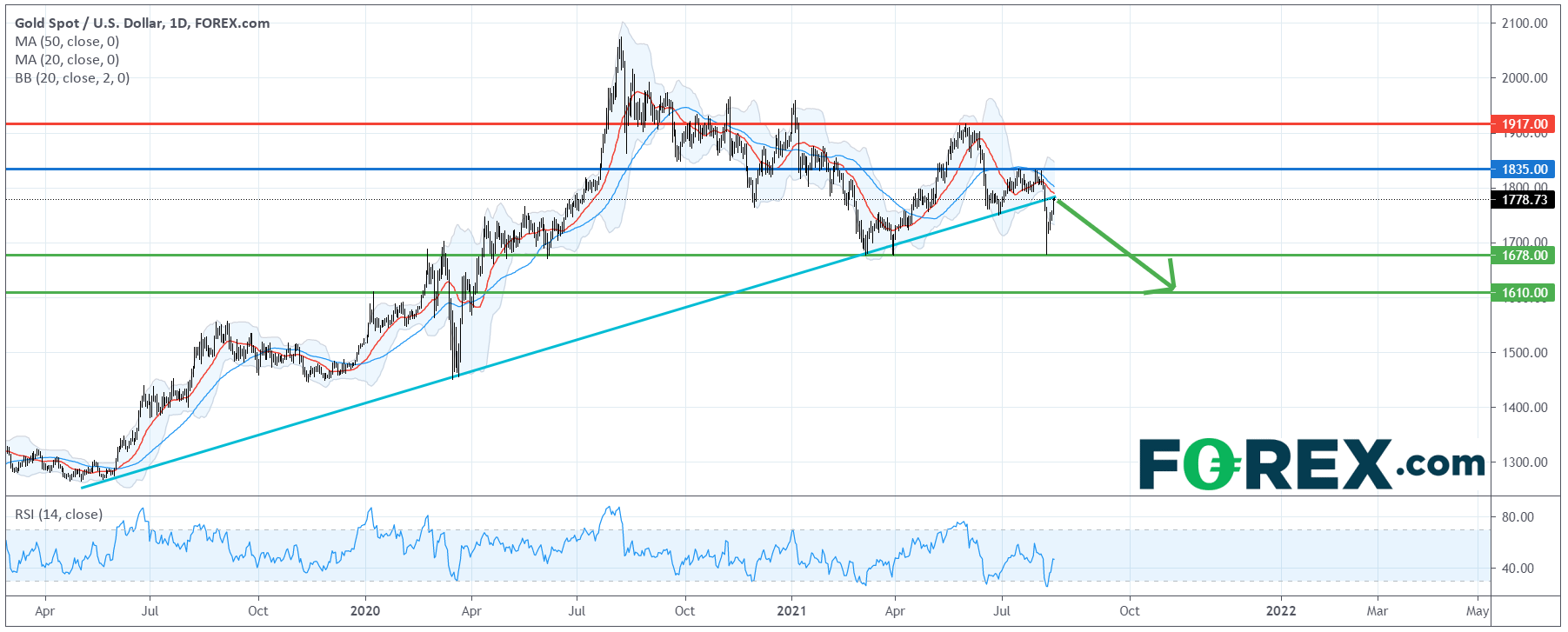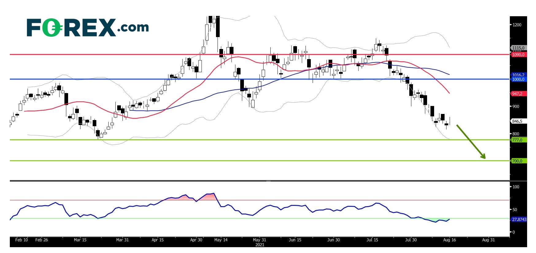 只要看跌的主要阻力 (止损) 位1,835美元不破,价格预期将下探1,678美元及1,610美元。