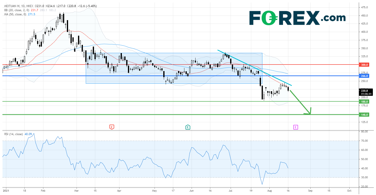 中国最大的外卖平台 美团 (3690.HK) 近期饱受中国加强互联网行业监管的压力,股价由今年2月份的高位损失超过50%。