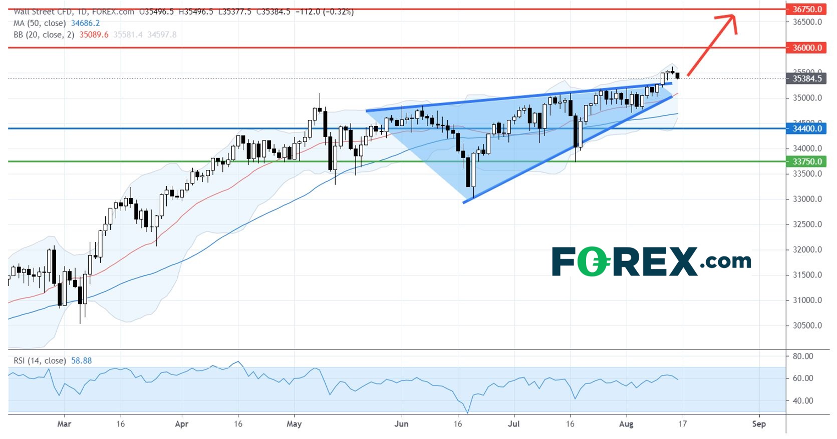 若华尔街指数CFD已明确地升破我们之前所定的第一上行目标35,000点,下一站将是36,000点。若上破36,000点,华尔街指数CFD会向另一上行目标36,750点进发。