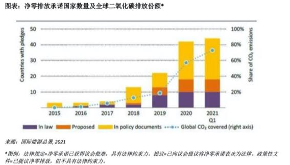 近年来,全球各地政府对于减少碳排放的承诺及对能源转型的支持显著加速。根据瑞士百达资管(Pictet)的分析,5月中,国际能源总署(IEA)首次发布了《2050年净零排放:全球能源行业路线图》。过去三年间,各地政府对于净零排放的承诺行动明显加快,2018年,这些承诺行动仅覆盖了全球排放量的10%,而到了2021 年,则达到了全球 GDP与二氧化碳排放的75%左右。不仅如此,这些承诺行动中有将近20% 已纳入法律法规,更多也将很快进入立法流程。