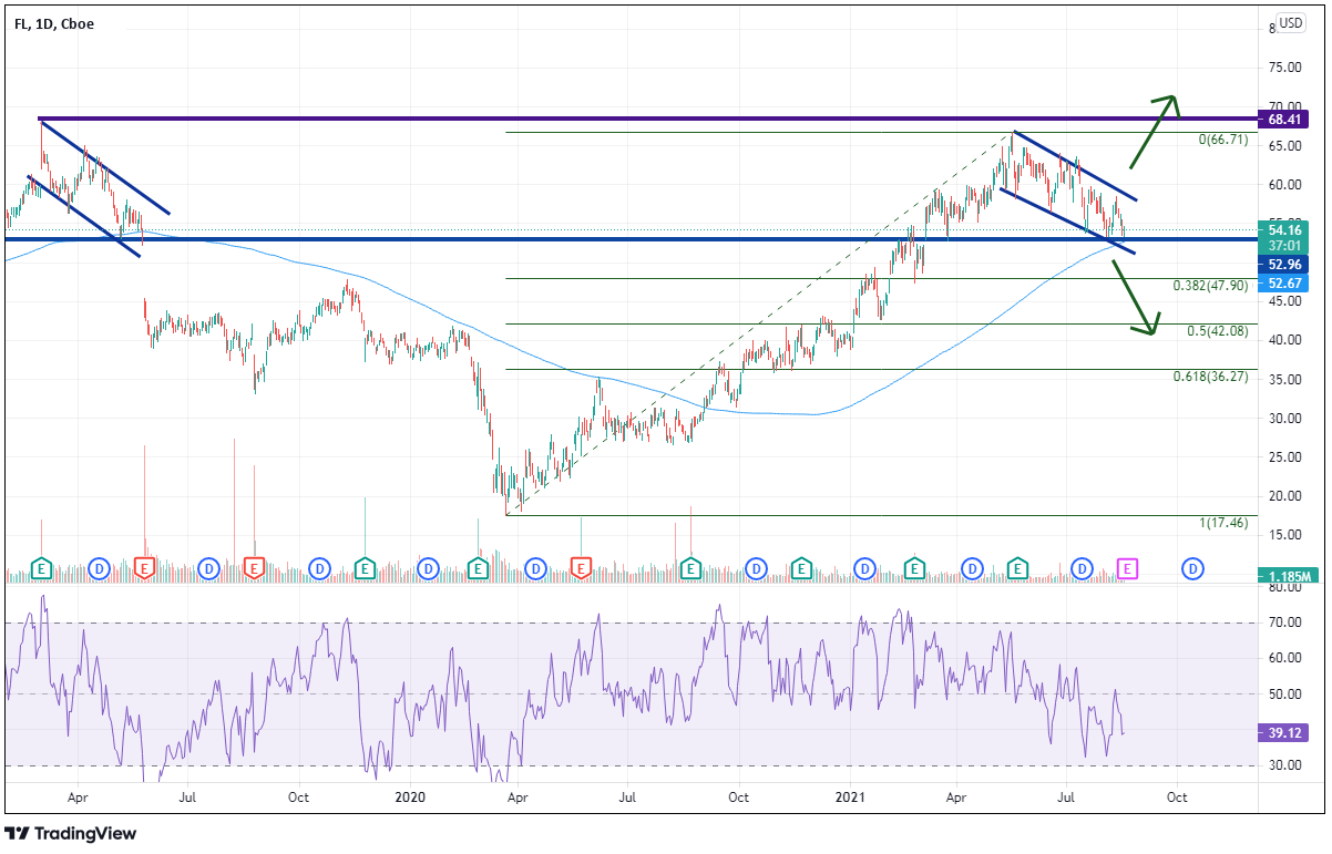 自2020年3月跌至17.50美元附近疫情低点以来,Foot Locker一路上扬。该股最终于2021年5月中旬触及66.82高位,测试2019年3月创下的68.41前高点。之后,股价已修正回调至200天均线略上方52.96水平支撑。请注意,2019年高点以来的推低与目前自高点以来的推低如出一辙: