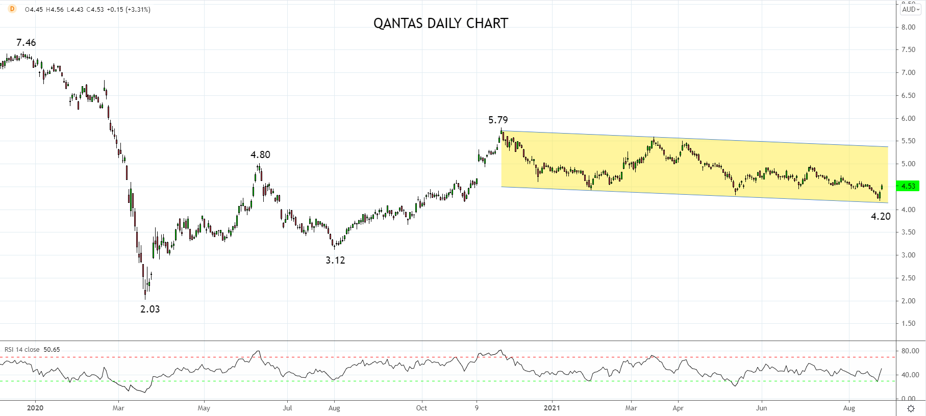 该股在昨天触及4.20澳元低点后,今天上午反弹升穿4.55澳元,确认下文强调的趋势通道支撑功能完好。