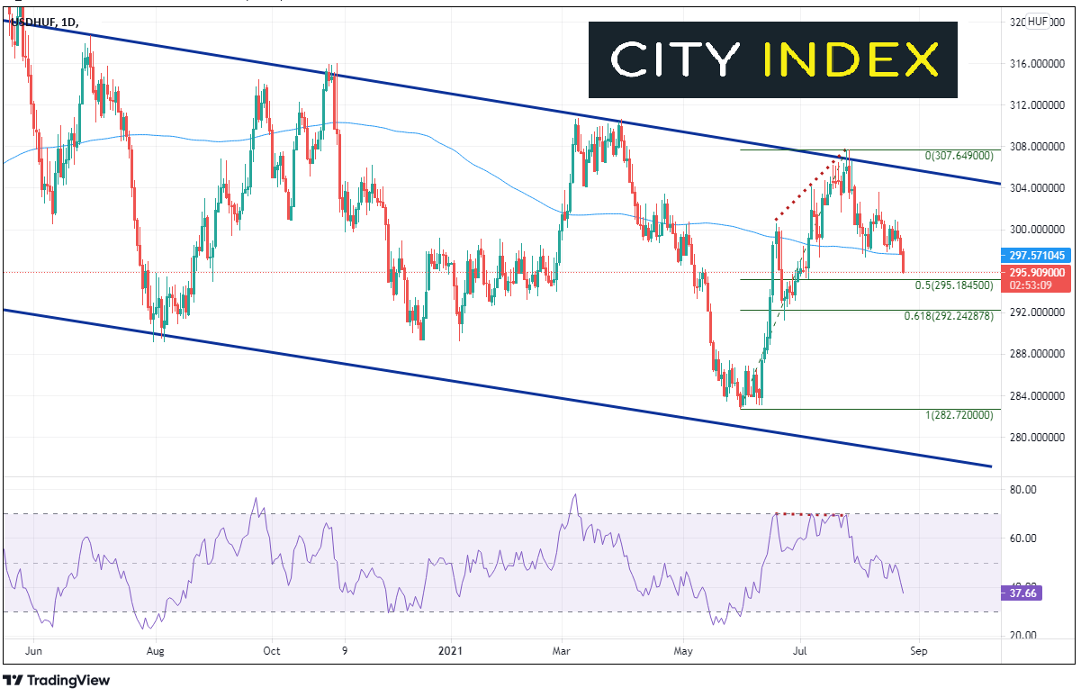 自2020年5月以来,美元/匈牙利福林一直交投于有序下行通道中。7月下旬,货币对测试通道顶部趋势线307.6490附近但未能穿透,回落至通道内部。请注意,在进入这些高点时,RSI开始与价格背离。在加息预期及随之而来的鹰派情绪影响下,美元/匈牙利福林过去2天下跌了1.02%,失守200天均线切入位297.5725。汇价正逼近295.1845附近6月1日低点至7月22日高点上行之50%回档以及水平支撑位。下方不远处292.2429附近可见61.8%回档位。