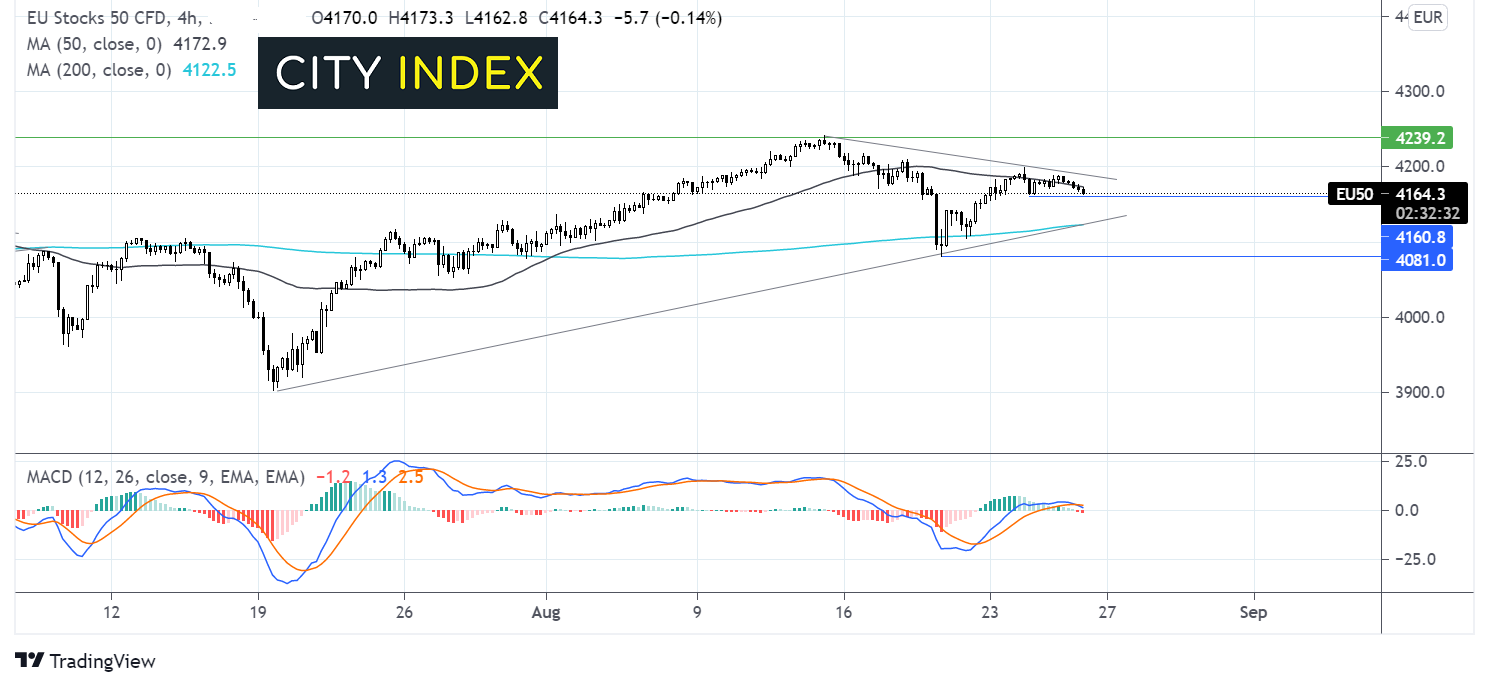 欧洲斯托克50指数自8月13日创下的4239历史高点回落。不过,7月中旬以来上升趋势保持完好。