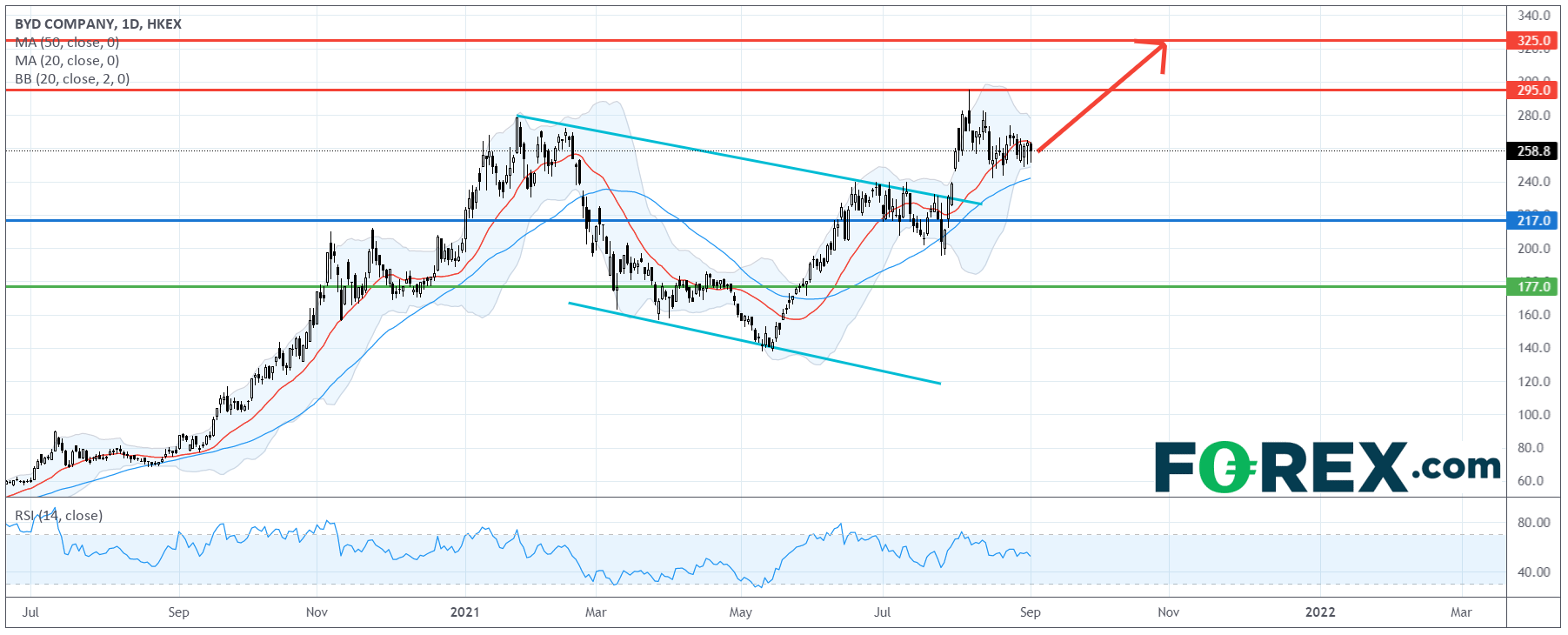 从技术角度看,如日线图所示,比亚迪股价走势依然坚挺。此前,它上破了1月以来的下降通道,目前正在上升的50日移动均线提供支撑。