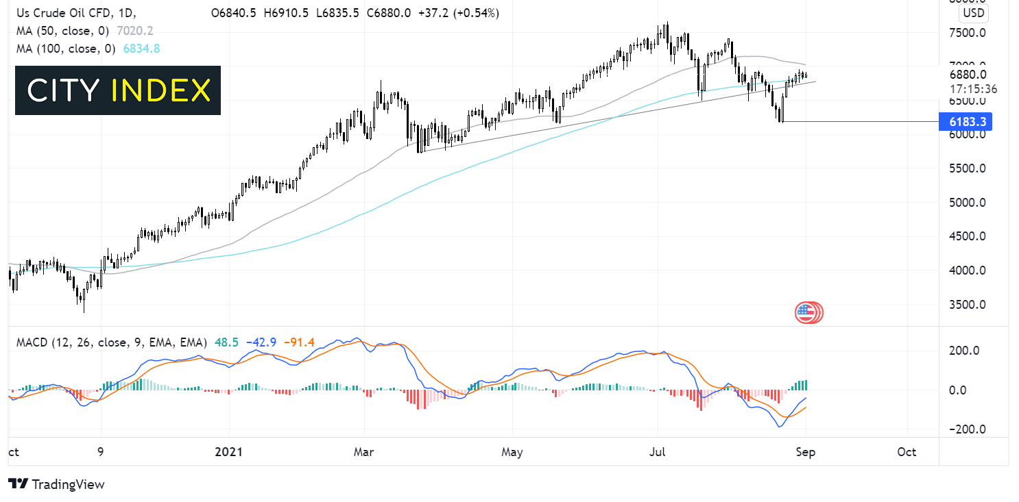 WTI原油自8月低点6180反弹,收复数月上升趋势线支撑。MACD指标看涨,加上重拾6850附近日线图100 均线,让买盘对进一步攻向心理关口7000及50均线7030充满信心。