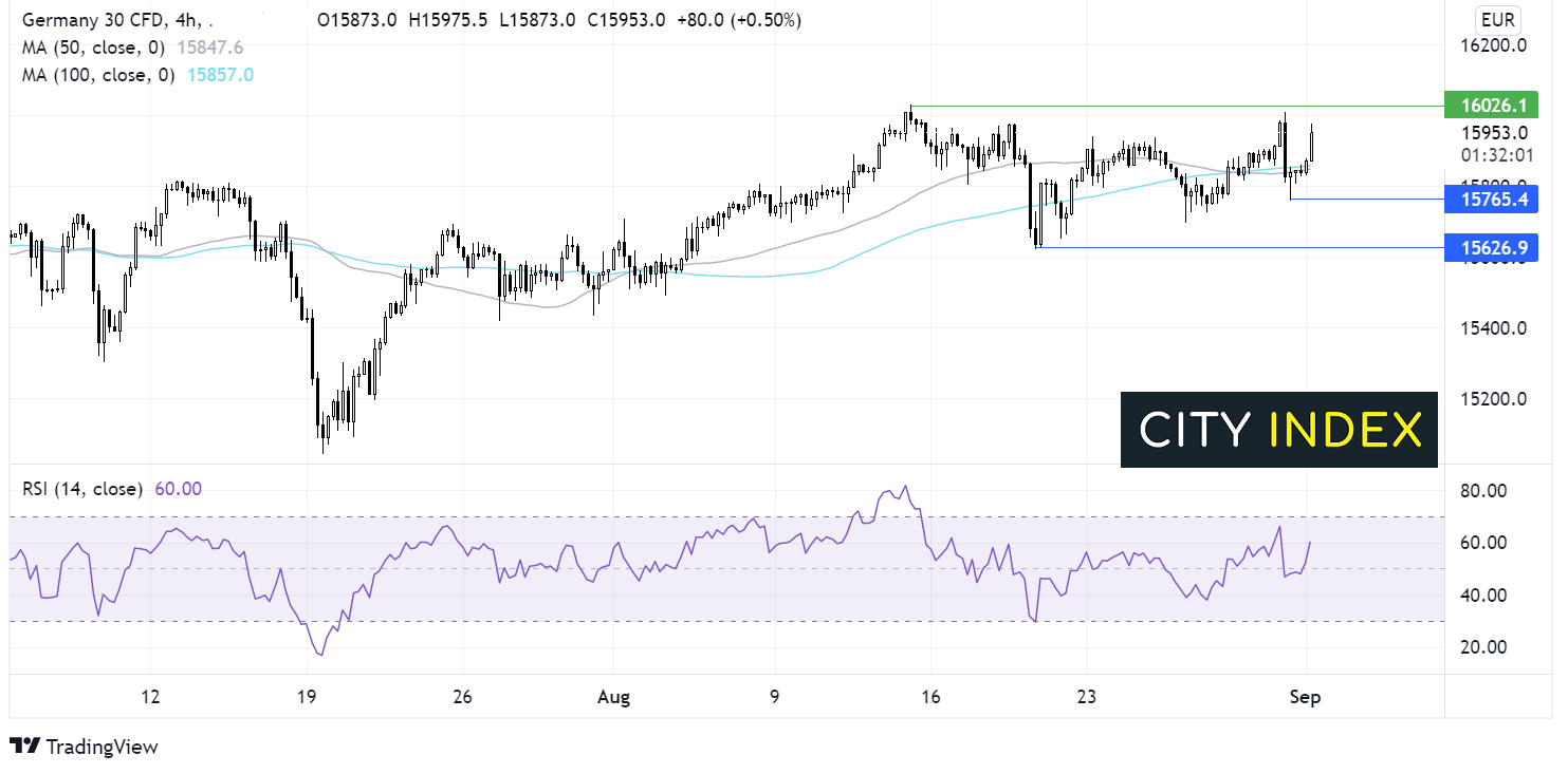 Dax指数早盘飙升,上穿4小时图50和100均线。RSI处于看涨区域,但仍未达超买,支持进一步走高。买家目标为16000和16030,再创历史新高。
