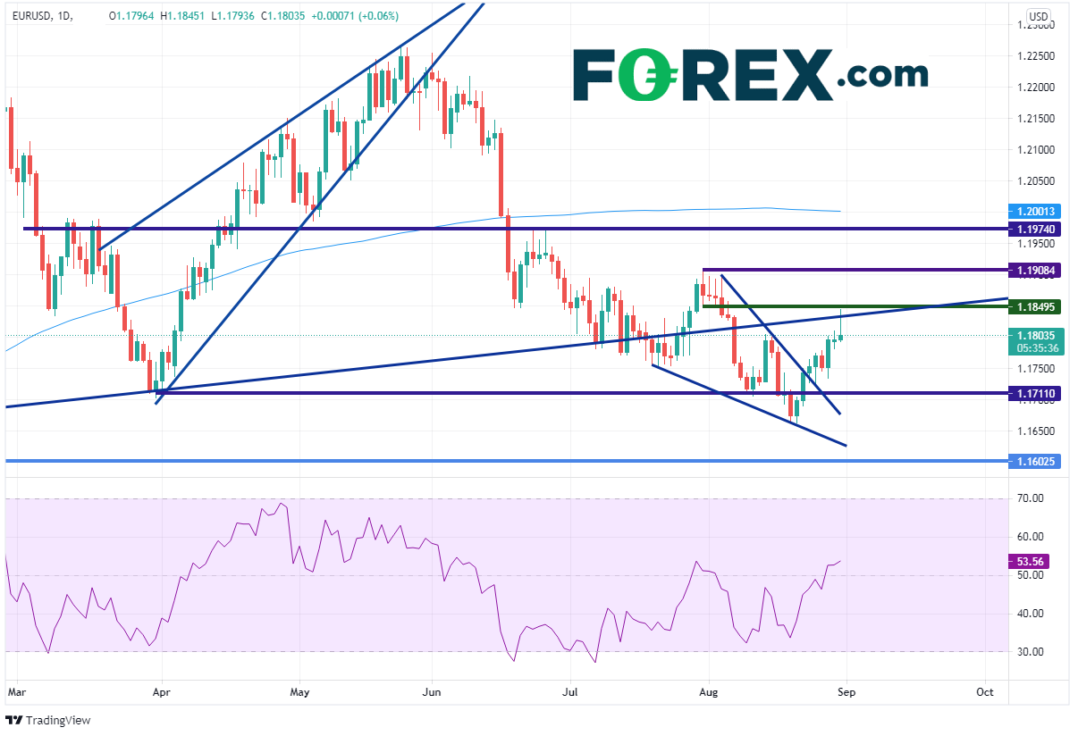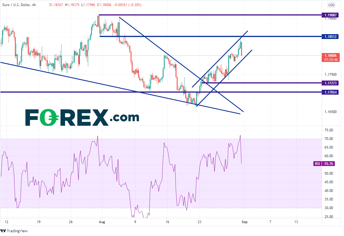 欧元/美元已于8月24日打破下降楔形并且开始上涨,但周一日图在长期上升趋势线和水平阻力位处遇阻。如果K线收在1.1800附近,可能形成射日之星。该形态表明欧元/美元可能准备延续跌势。