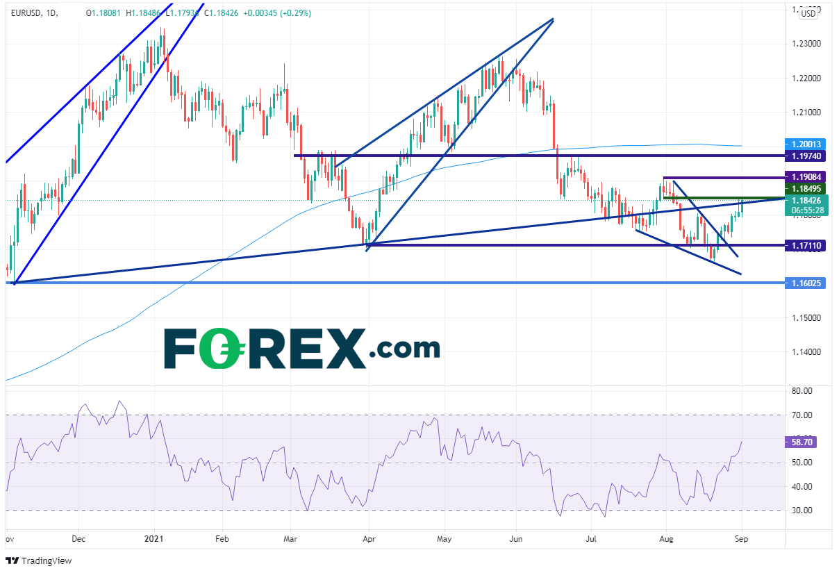 欧元/美元受ADP数据的推动上涨而美元指数下跌,与此同时,债券收益率下跌。欧元/美元日图再度攻击1.1850附近的水平阻力位,并尝试收上长期趋势线1.1835附近。这些价位上方的阻力位在1.1890和1.1900,那是7月底/8月初以来的系列高点(也是近期下降楔形突破后的完结走势)。