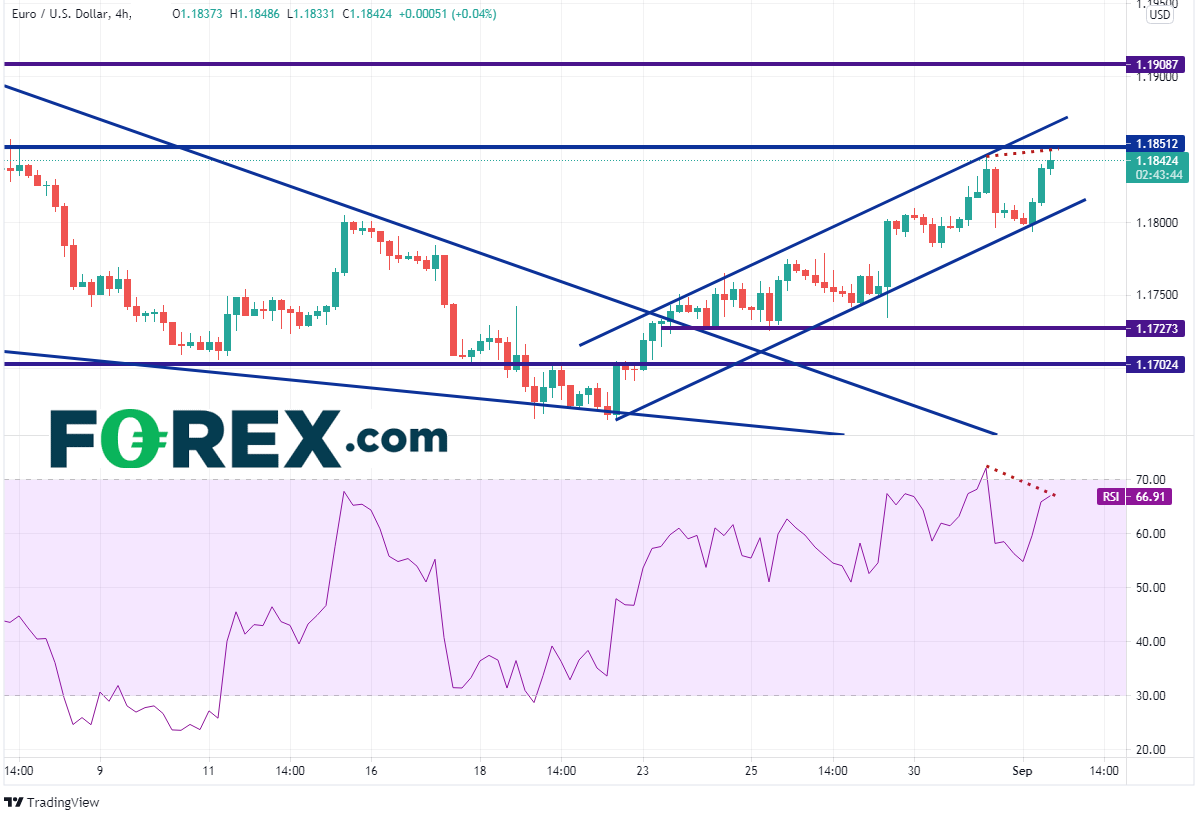 欧元/美元4小时图从8月20日以来一直在一个上升通道内走高,而1.1865附近的通道上轨趋势线是另一阻力位。支撑位在通道下轨趋势线1.1805附近,接着是水平支撑位1.1727和1.1702。另请注意,RSI短期内正与价格背离。所以,欧元/美元可能准备回调。