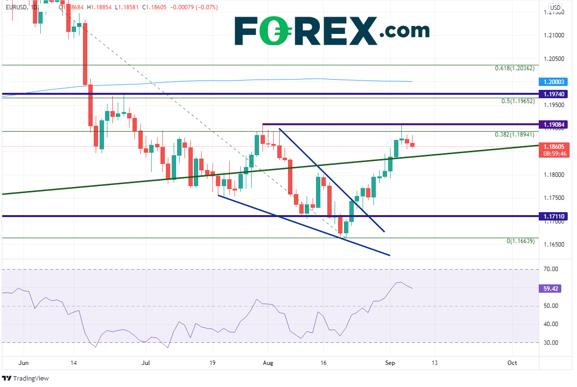 欧元/美元一直围绕着2020年11月初以来的较长期趋势线(请看下图绿色线)徘徊,而8月初以来始终交投于下降楔形中并于8月24日上破该形态。欧元/美元上周五突破楔形形态并到达目标(100%回档位)1.1908。强阻力在8月2日以来的近期高点、5月25日高点到8月20日低点的38.2%回档位,即1.1894附近。上周五的日图K线为射日之星,暗示反转。