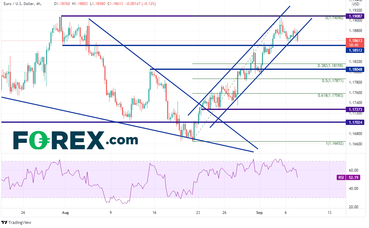 欧元/美元4小时图自脱离8月20日低点以来有序上涨并形成上升通道,周一打破了该通道的下轨趋势线,即1.1870附近。如果继续下跌,第一支撑位在水平支撑位兼(日图)上升通道所在的1.1840/1.1850附近,然后是8月20日低点到9月3日高点的38.2%回档位,即1.1815附近,接着是水平支撑位1.1800附近。盘中阻力位在上升通道的下轨趋势线1.1880附近,接着是近期高点1.1908,然后是前述日图行情的50%回档位1.1965附近。