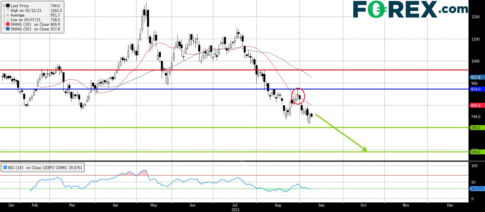 看跌的投资者可将874元人民币视为主要阻力(止损)位,下行目标在700元人民币及590元人民币。