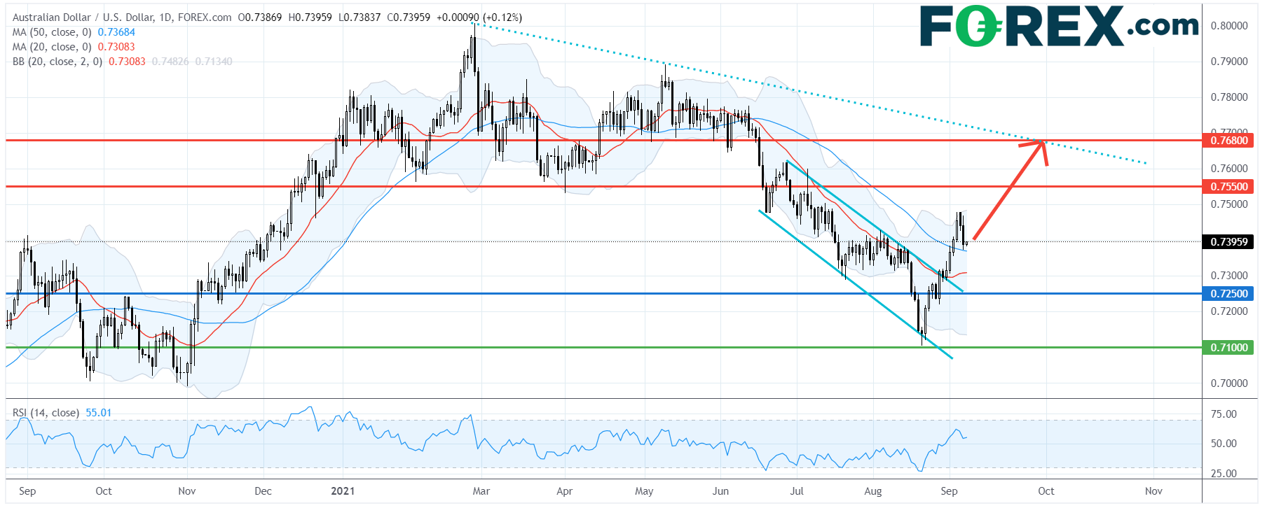 从技术角度看,如日线图所示,澳元/美元正在组织更多的反弹。此前,它升破始于6月的下降通道,并回到20日及50日移动均线上方。