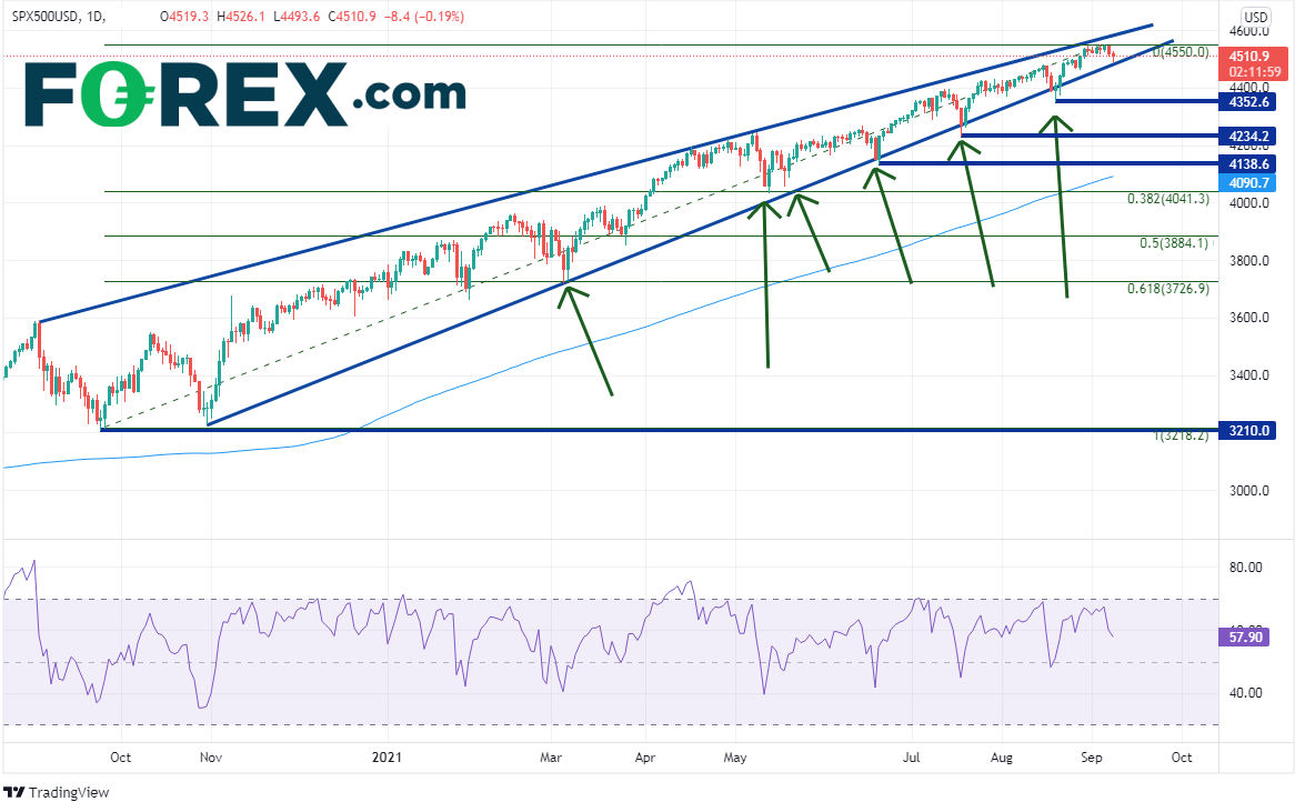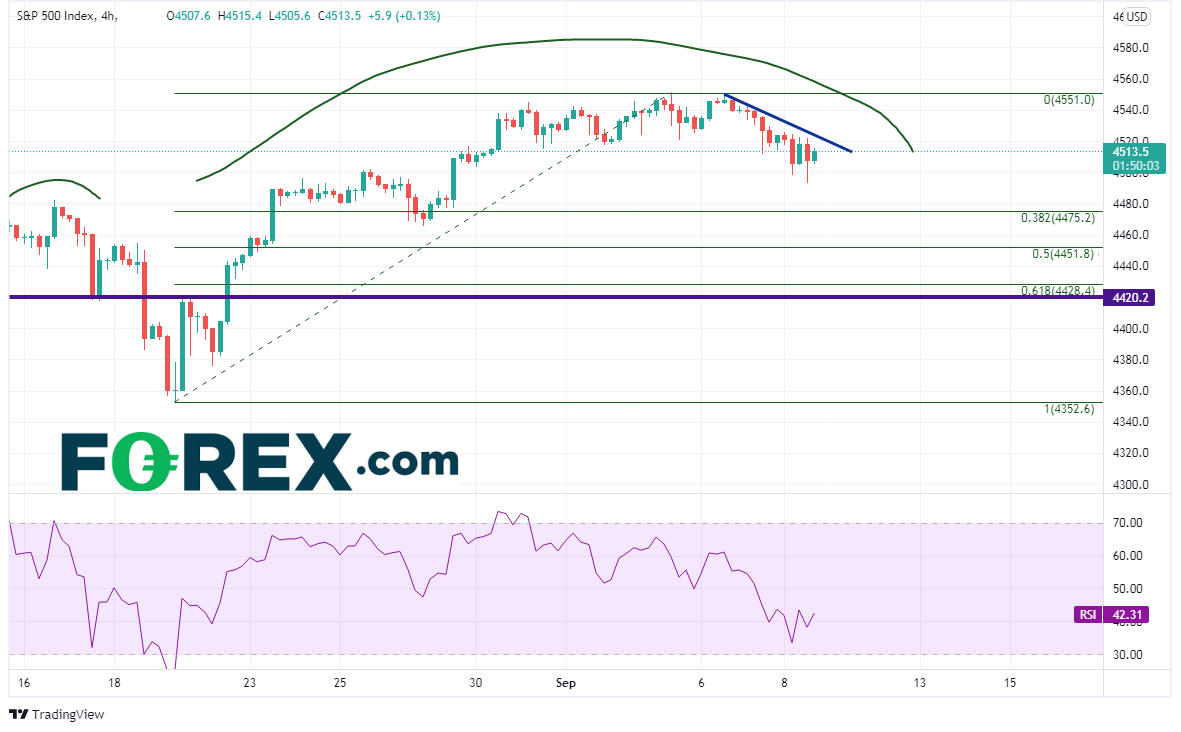 4小时图上,标普500指数似乎在构建圆顶形态(也有可能是头肩顶形态,只不过头部没有完成、右肩也没有成形)。4475是8月19日低点到9月3日高点行情的38.2%回档位,也在上升楔形下轨趋势线(4480)附近。