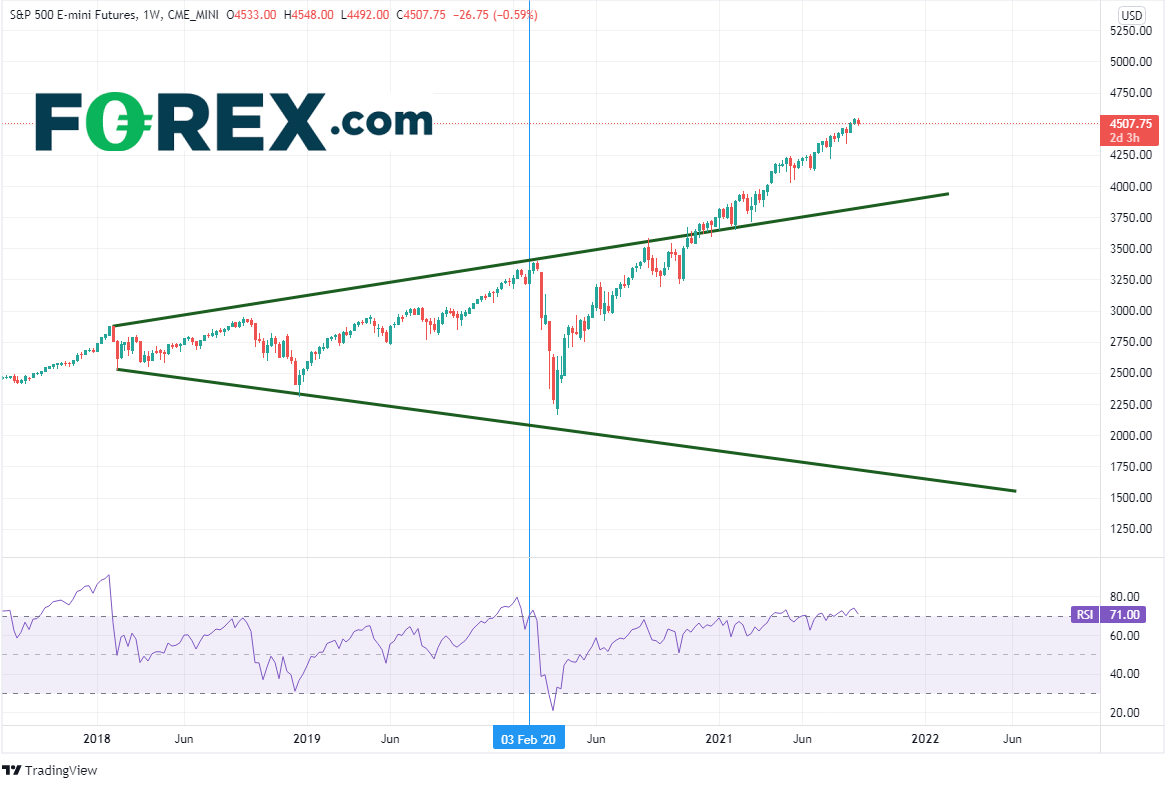 日图上从目前价位到100%回档位之间筑有无数的支撑位,而在楔形趋势线下破后就有诸多水平支撑位,分别落在4352.6、4234.2和4138.6。不要忘了,每次价格下破上升楔形趋势线,多头就逢低买入。200天移动均线就落在下方不远处的4090.7,接着是2020年9月低点到2021年9月3日高点行情的38.2%回档位,即4041.0附近。