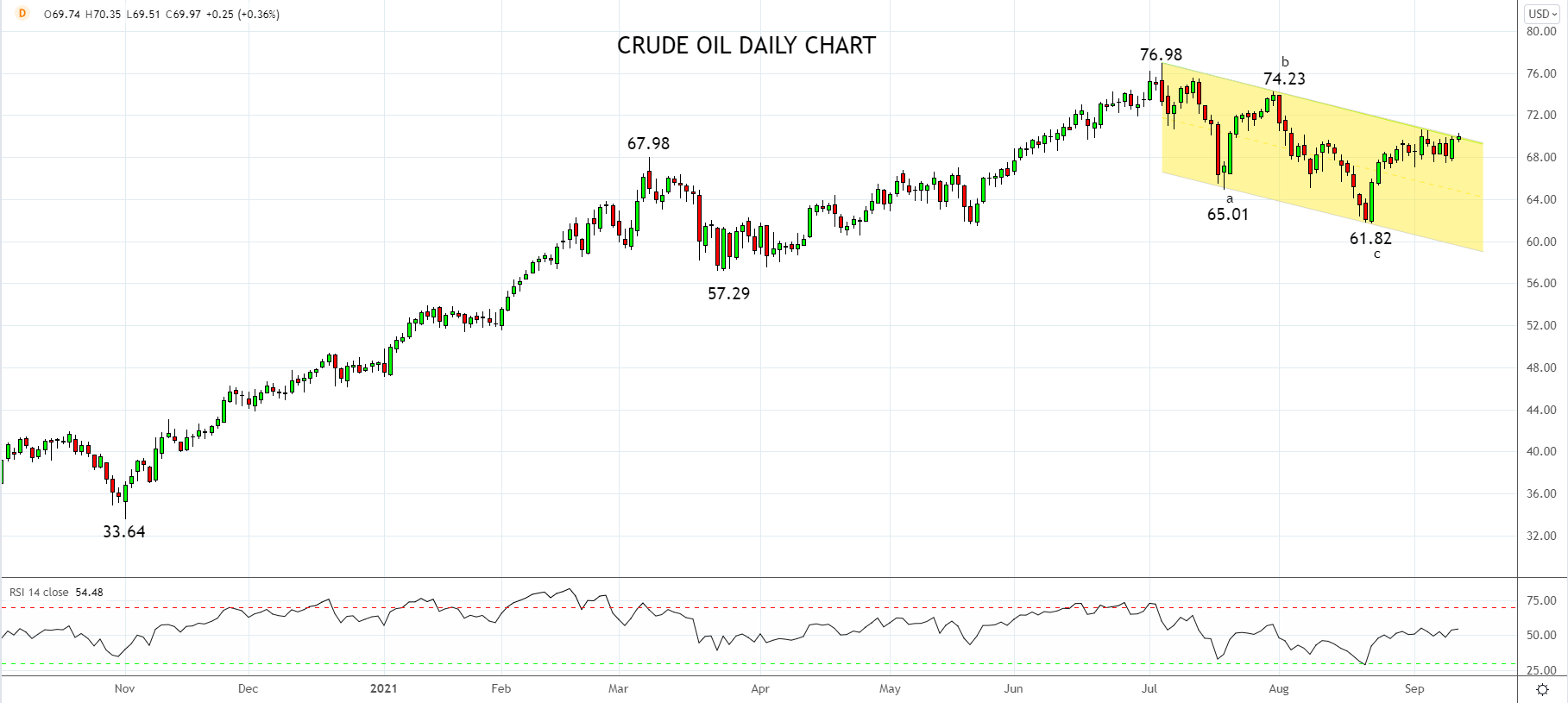 如下图所示,油价从76.98高点回撤至8月低点61.82似已完成三浪修正性回撤行情,如果突破或收上近期高点兼趋势通道阻力70.50一线,可能暗示正在反击并且有可能突破7月高点76.98。