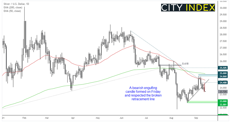 上周五现货银价形成看跌吞噬K线/外包K线。自从5月触顶以来日图趋势一直向下,并且50天指数移动均线始终构成阻力。随着银价上周下破回档位并且上周五受制于其下,暗示价格可能准备下破。受制于25我们继续看跌,但也可利用24.40高点调整风险管理。下个支撑位在23.0附近。