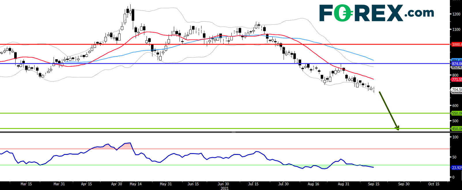 目前铁矿石期货价格很大机会下滑至550元人民币,甚至跌至下一個支持位450元人民币。看跌的主要阻力 (止损) 位維持在874元人民币 (近布林带上线)。