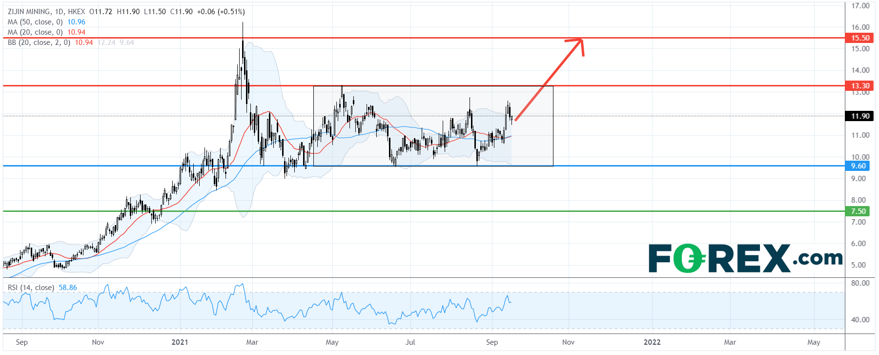紫金矿业(2899.HK):持续盘整,上方首个目标13.30港元