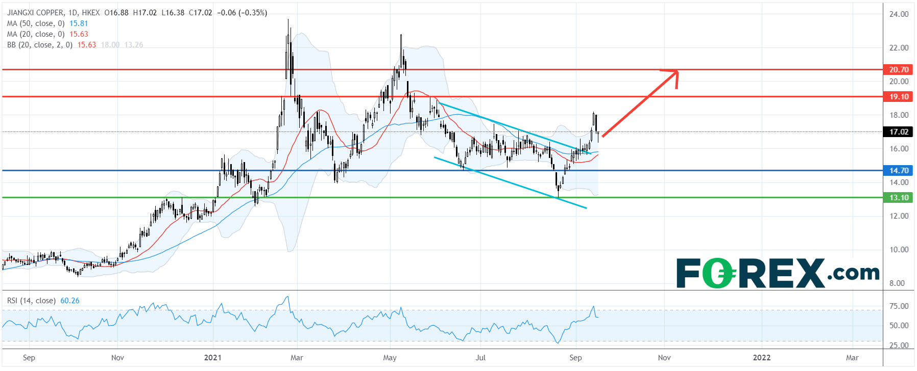 中国龙头铜矿商江西铜业8月中旬跌至近13港元的低点后,已经反弹了超过30%。该公司上月末公佈,上半年每股盈利涨超3倍至0.88元人民币。据彭博调查,全年每股盈利预测为1.62元人民币,以现价计算,相当于8-9倍市盈率。