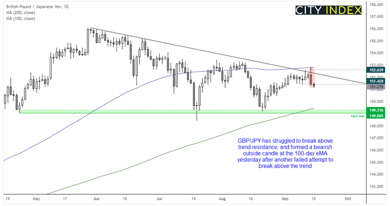 如果通胀数据令人失望,可关注英镑/日元。到目前为止,汇价一直难以突破趋势阻力位,最近一次的失利导致汇价在两周低点附近构筑一条大型看跌吞没/外包线并测试月图中枢点。鉴于昨天阻力位置的看跌K线规模,我们在日线图153下方继续看跌,汇价或探向150,甚至可能跌入149.06/30附近低点。