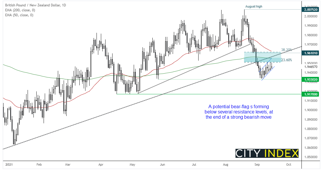 英镑/纽元技术面结构仍有看跌潜力。8月高点以来3.6%的跌幅轻松突破了两根上涨趋势线,价格现在向上盘整,可能形成看跌旗形形态。阻力位在23.6%回档位,强调了强下跌趋势中回调的无力。而且,附近的200天指数移动均线和破败趋势线也构成阻力。