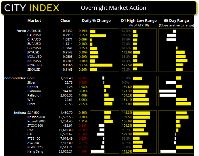 能源价格的上涨使得股市收复周二跌幅,而且时段内大部分时段在反弹。标普500指数涨0.82%,11个板块中有10个板块走高,领涨的是能源和材料板块。标普500指数守住50天指数移动均线和趋势线支撑,抹去形成看跌吞噬K线前一天的涨幅。站上周一高点的话,可以假设波段低点就位。科技板块同样表现强劲,纳斯达克100指数上涨0.8%左右。