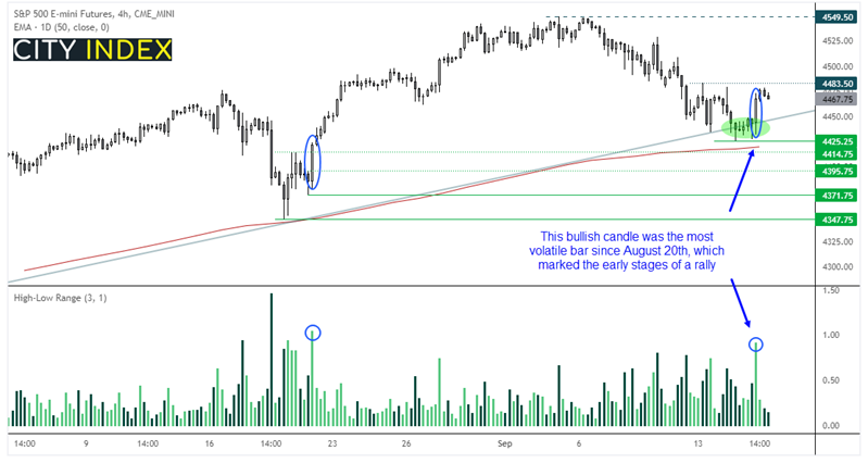 标普500指数 E-mini期货合约本周假下破趋势线支撑,但守住50天指数移动均线,加上假下破甚至都没有考验该均线的事实,表明上涨动能正在积聚。另请注意,昨天4小时图上形成的长阳线是8月20日以来波动区间最大的K线,其刚刚脱离结构低点随后就走出新一轮反弹行情。所以,守住4425低点我们继续看涨。我们期待站上4483.50,从而可以假设上涨势头延续。