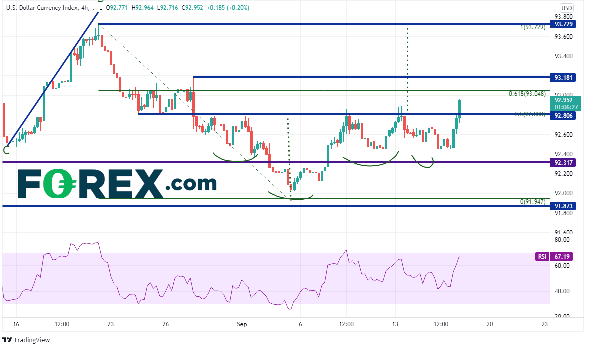 过去一年半的大部分时间里,好消息利多美元。这次也不例外,因其提升对FOMC下周宣布缩表的预期。美元大涨势头本就贯穿整个欧洲时段,在零售销售发布之后延续涨势。美元指数4小时图站上前高点,似将收上当前K线92.80,那是头肩底形态(拥有两个右肩)的颈线以及8月20日高点到9月3日低点的50%回档位。
