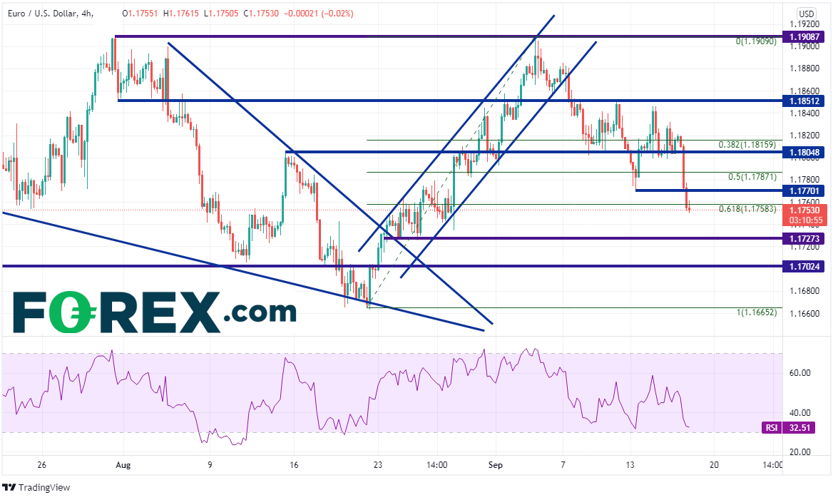随着美元指数大涨,欧元/美元不出所料下跌(欧元构成美元指数57.6%的权重)。周四,该货币对4小时图击穿多个重要支撑位,其中有8月20日低点到9月3日高点的50%和61.8%回档位。若欲继续下探8月20日低点,首先必须攻克水平支撑位1.1727和1.1702。RSI正逼近超卖位,价格可能准备好盘中反弹。上档水平阻力位先后落在1.1770和1.1804。