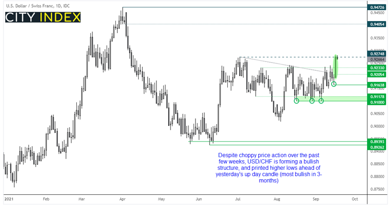 美元/瑞郎昨天表现强劲,并迎来3个月来最为看涨的一个交易日。汇价收于六月高点,但更重要的是它突破了长达数周的混乱走势及交叠区间。十字线低点0.9164上方仍然看涨,我们迫切希望看到低波动性下的回调,在其探入0.9230/40或0.9205时寻求做多,目标为汇价升穿6月高点0.9300。