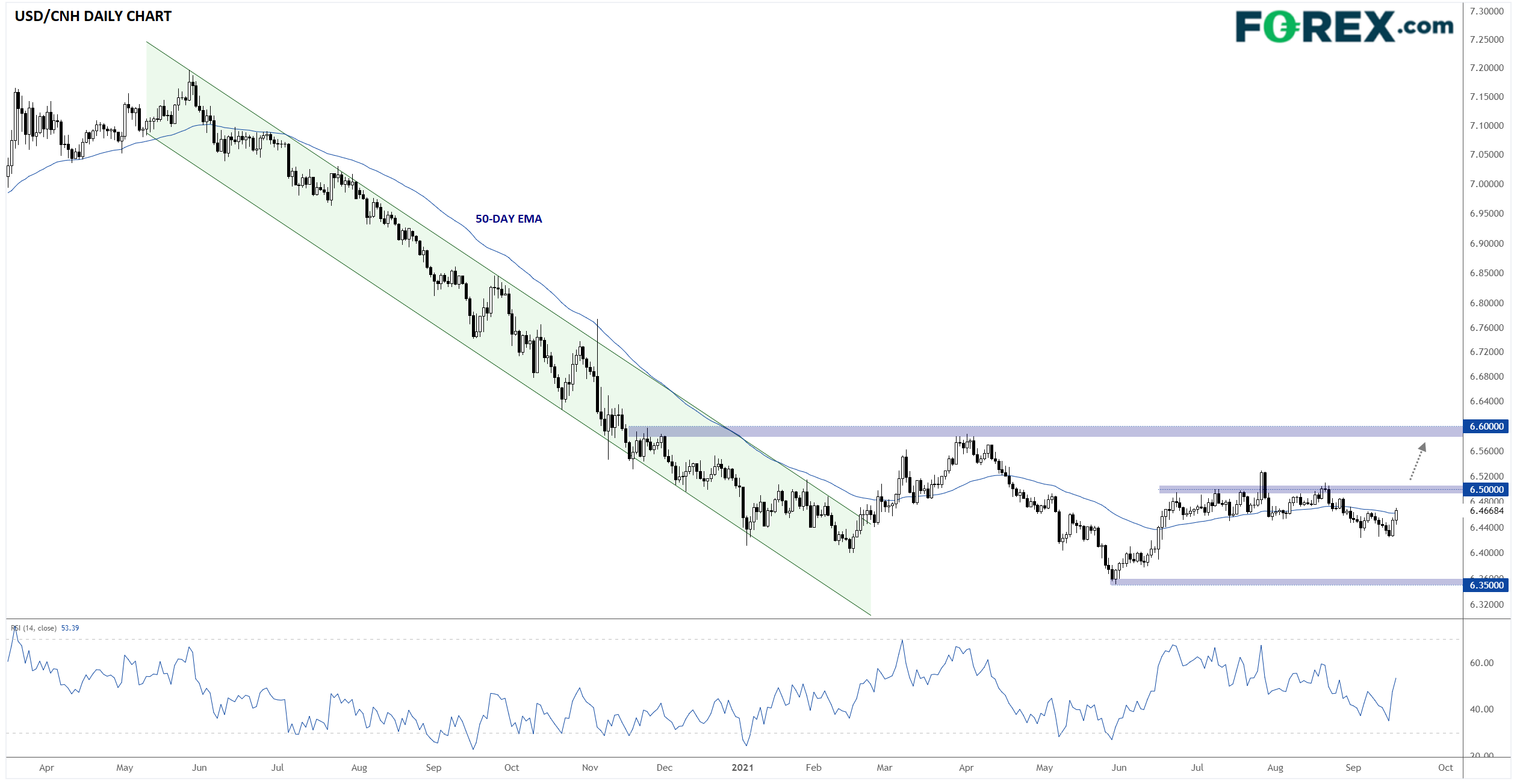 如果美国采取更多措施抑制两国之间的贸易往来,则中国人民银行可能允许人民币贬值以图抵消对经济的不利影响。短期来看,美元/离岸人民币如果站上6.50,可能发出或蓄势扩大涨势的初步信号,目标为6.60区域的10个月高点: