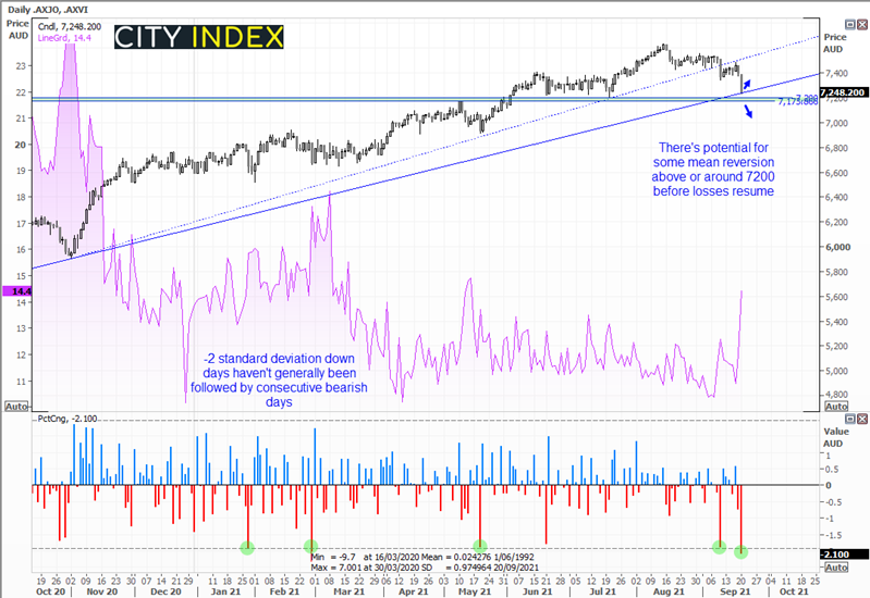 ASX200指数因铁矿石价格暴跌以及恒大危机带来的广泛避险情绪而下跌,跌幅超过2%,为2月底以来之最。在出现-2标准差日后,ASX200指数现已在长期趋势线处企稳。交易者应继续关注铁矿石价格和恒大危机的相关后续影响的同时也应注意,在出现-2标准差日后一般不会继续下跌。再加上长期趋势支撑线与7200附近的支撑位,我们敢说ASX200指数或应当先走出某种均值回归行情后才可能继续下跌。