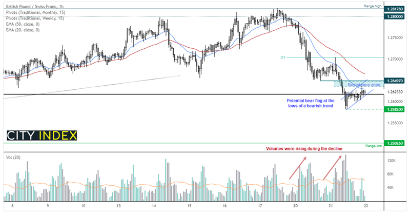 英镑交易员还可考虑英镑/瑞郎这对同样具下破风险的货币对,不过我们将把时间轴缩短至1小时。自汇价于1.250-1.2800区间顶部转跌后,过去两天下挫了近2%,从而构筑一个相当不错的看跌趋势。20小时均线和50%回档位作为阻力封顶,1.2650下方我们仍然看跌。货币对徘徊于月图枢纽附近,正在形成旗形,若下破昨日低点,旗形确认。