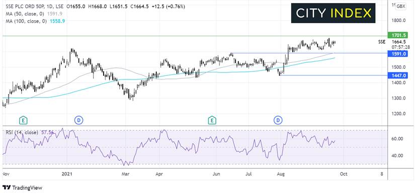 SSE股价自3月初以来一直呈上升趋势,交投于50和100均线上方,正逼近关键水平1700便士,此处为2020年2月触及的疫情前历史高点,2015年和2008年1月也曾站上这一水平。RSI暗示后市进一步上涨,不过1700便士可能构筑顽固阻力。只有下穿1590便士才能打消短线上涨趋势,跌破1450便士,卖盘获得动能。