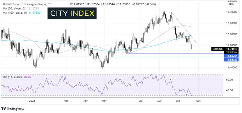天然气进口增加可能会扩大英国贸易赤字。根据德意志银行(Deutsche Bank)数据,英国自挪威进口的天然气量超过了英国国内产量。最近大宗商品价格的上涨可能一定程度上解释了英镑/挪威克朗过去一个月遭遇大跌的原因。