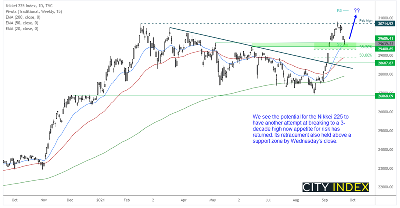 9月初突破趋势线阻力表明动能已与其长期趋势接轨,而未能收于其上则对修正行情做出预警。日经期货市场已站上3000点,所以现货市场今天有可能随之走高。请注意,周三的低点守住了29,480 – 29,685支撑区域,该区域本身在38.2%回档位上方。假设价格今天站上30000,则守住近期低点(如果需要额外的回旋余地,那么应该守住斐波纳契位)我们继续看涨。
