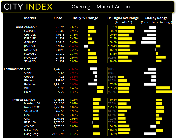 商品货币遥遥领先,纽元、加元和澳元领涨幅,而日元和美元垫底。纽元/日元是最强交叉盘,上涨1.5%左右并且波幅是其平均真实区间的2倍。